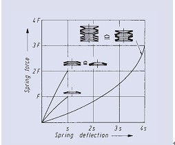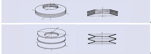 可以通過將由不同片數(shù)碟型彈簧組成疊合組合彈簧或不同厚度的單片碟型彈簧組合成碟型彈簧組來(lái)獲得遞增的載荷特性曲線,在這種情況下,彈簧組達(dá)到壓平位置或極限行程后,單片彈簧或組合彈簧將不再對(duì)彈簧的變形量產(chǎn)生影響。