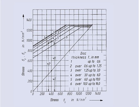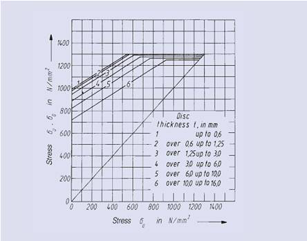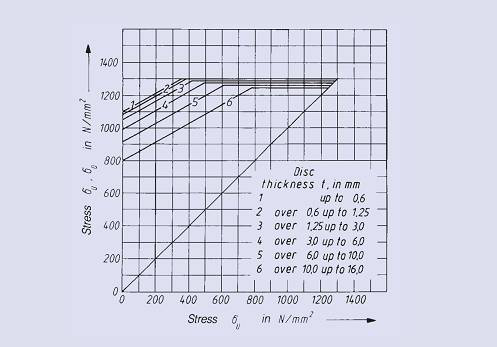 以下所示疲勞強度圖的獲得基于Mubea對碟型彈簧多年的測試結(jié)果。這些結(jié)果中所示為決定碟型彈簧疲勞壽命的下表面許用計算應(yīng)力。疲勞強度圖也對不同彈簧的尺寸、厚度以及載荷循