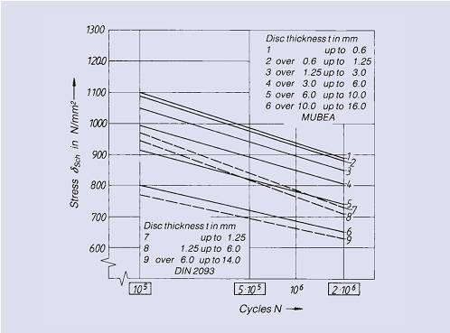 與DIN2093標(biāo)準(zhǔn)的要求相比,Mubea碟型彈簧可以承受較高的動(dòng)態(tài)應(yīng)力和工作載荷循環(huán)。疲勞強(qiáng)度圖中動(dòng)態(tài)應(yīng)力和許用應(yīng)力與DIN2093標(biāo)準(zhǔn)相應(yīng)數(shù)值的經(jīng)較也說(shuō)明了這一點(diǎn)。(見上圖)